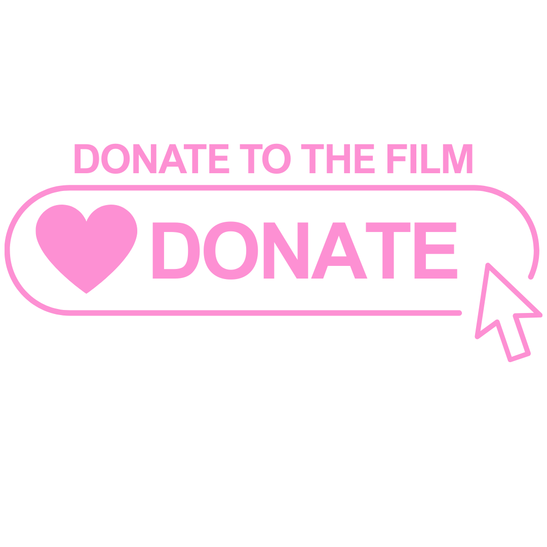 Pink text on black background reading 'Donate to the film' with a heart icon and a clickable cursor graphic.